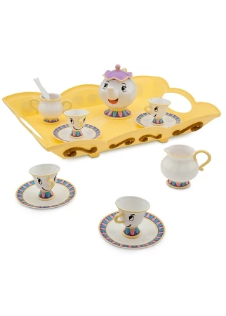 - Set includes Lumiere, Mrs. Potts teapot, Chip cup, two additional teacups, three saucers, creamer, and serving tray